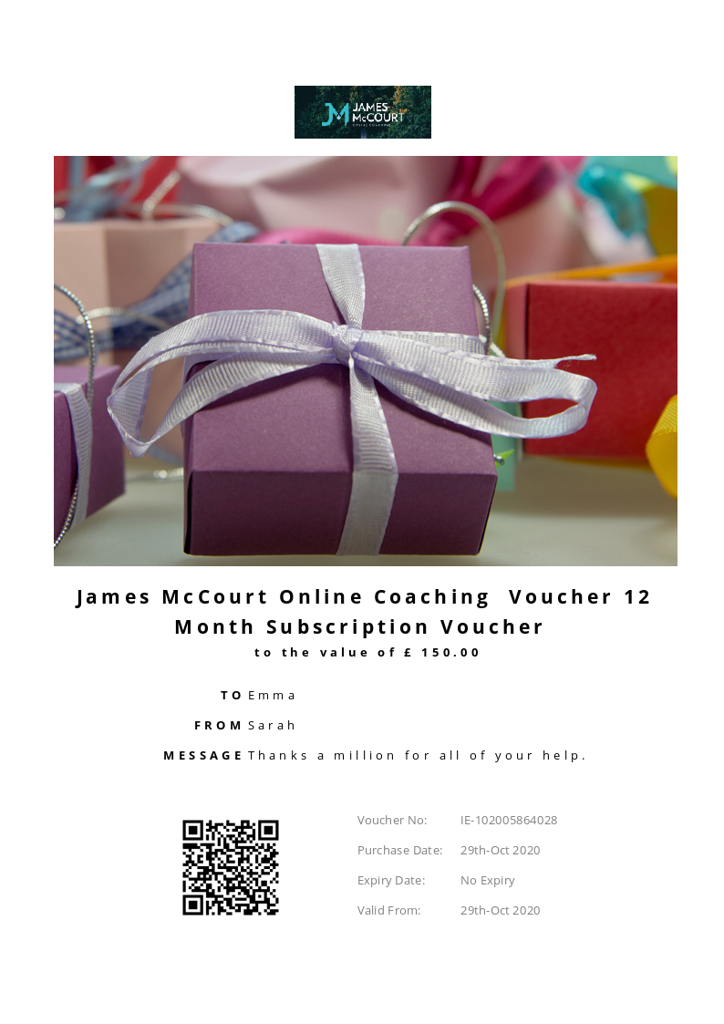 James McCourt Online Coaching allows you to purchase instantly printable gift vouchers, special offers and tickets using the Voucher Connect platform.